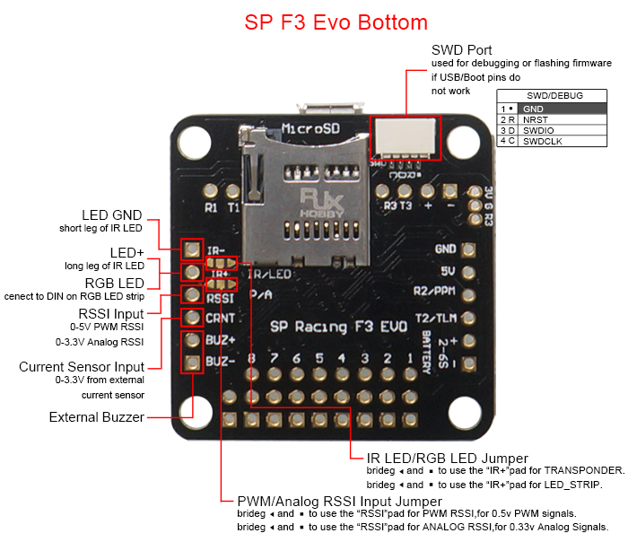 1. Micro SD Card Reader-can record flight data logs easily onto and SD card (not limited to 128mb like on other flight controllers)