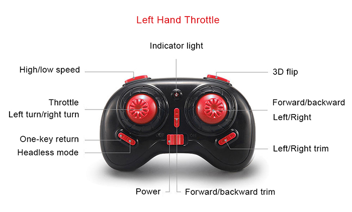 Function: Forward/backward, up/down, left/right, sideward flight, hovering, 3D-flip, headless mode, high/low speed, one-key return, LED lights