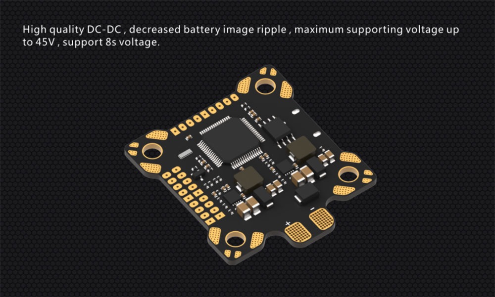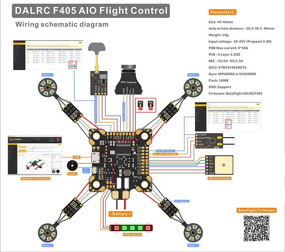DALRC F405 AIO flight controller adopted high quality MCU STM32F405, MPU6000 gyro, built-in OSD, 9v/1.5A, 5V/2A BEC and 200A PDB. The main feature of this flght controller is powerful performance, less jitter effect, less image ripple interference, support 8s voltage input and etc.