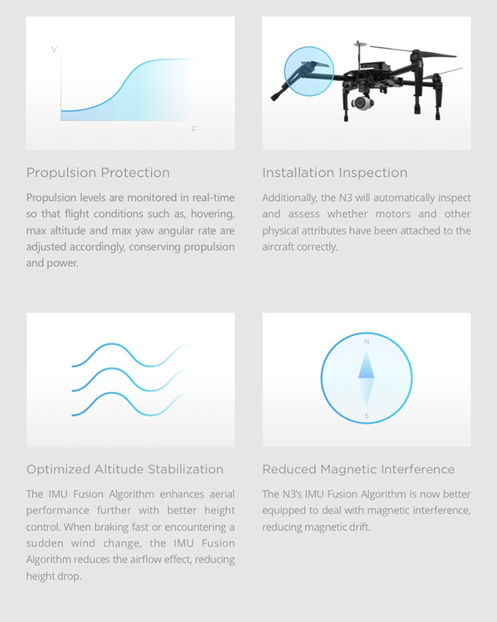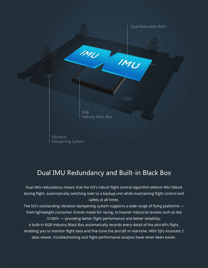 The N3 flight controller is compatible with professional remote controllers and receivers, DJI’s Intelligent ESC, DJI GO, Lightbridge 2, Datalink Pro and iOSD. It also integrates seamlessly with DJI’s Zenmuse series of gimbals and cameras, providing instant access to a whole host of flight applications. Compatibility with DJI Assistant 2 provides more possibilities for a multitude of industrial applications. With DJI’s Onboard and Mobile SDK, the N3 is ideal for hobbyists and professionals looking to create custom software solutions quickly and easily.