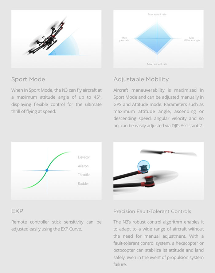 DJI’s latest generation of the NAZA series, the N3 flight controller, is tailor-made for a multitude of hobbyist and industrial applications. Its robust flight control algorithm is ideal for controlling a broad range of industrial and DIY multirotor aircraft, providing professional stability.