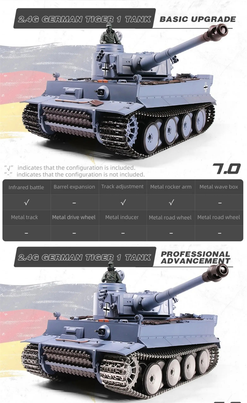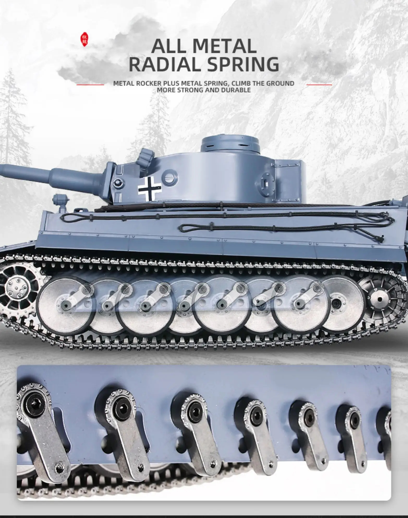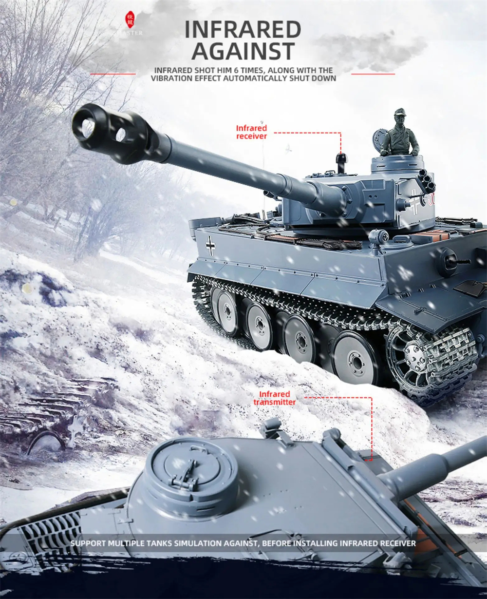 You can buy metal spare parts such as metal tracks, sprockets, idlers, metal bearings, road wheels, return rollers, better metal gearboxes(we customize some special gearboxes), better batteries(5000mah-7000mah), metal 360 degree limitless rotation system, muzzle flash and laser function, barrel recoil system, FPV(First Person View) WIFI combating systerm and so on. Please contact us. Some tanks could be upgraded to be full metal chassis and hull.