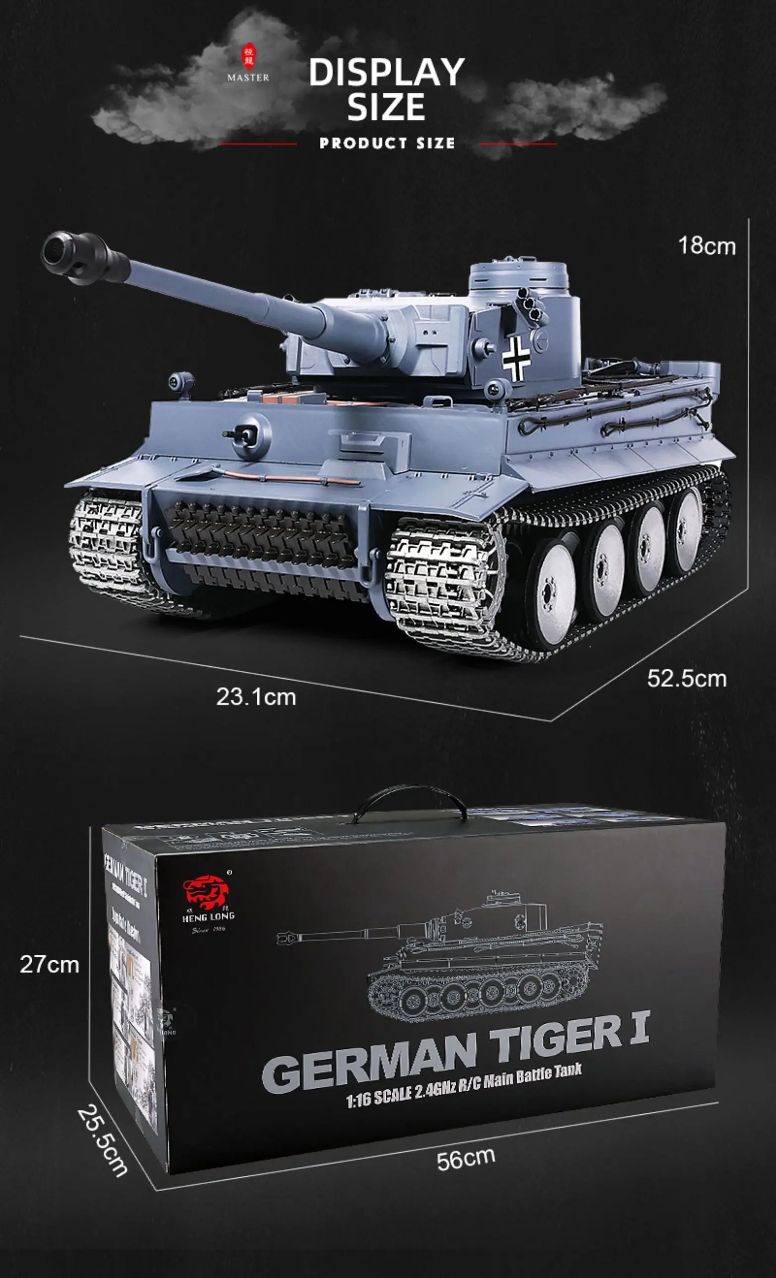 Series production of the Tiger began in August 1942. With its relatively stron armor, up to 100mm at the front, and the 8.8cm KwK 36 L/56 as main armament, the Tiger was a dreaded enemy on the battlefield. With just 1350 produced units of the Tiger, the military strategic importance was rather low, but he is one of the famous tanks of his time. The true to detail RC Tiger I Tank measures approx 520x240x200 (LxWxH mm). The HengLong Torro-Edition impresses with 2.4 GHz circuit board technology with integrated loudspeaker. Accessories such as matching stickers perfectly round off the true-to-scale replica.