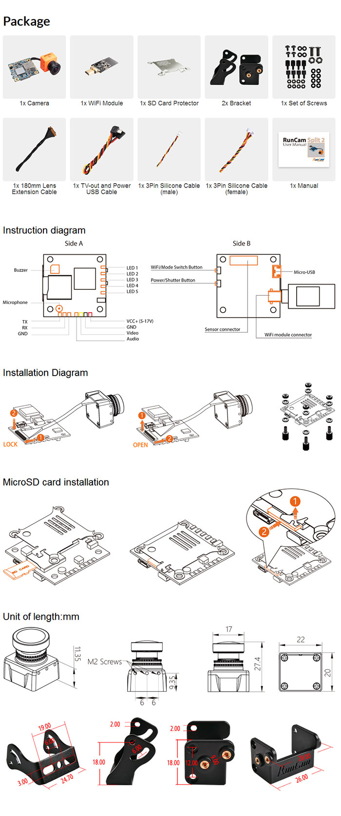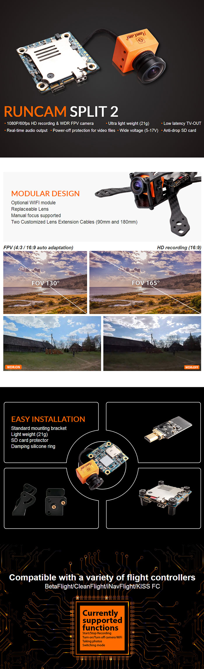 Runcam Split 2 HD FPV camera is the upgrade version of Split. The Runcam split 2 can be used as a FPV camera as well as a sports camera for recording HD footage (1080p@60fps). With this camera on your fpv racing quad, you do not need GoPro or other sports camera, making your build lighter in weight and cheaper in the whole budget.
